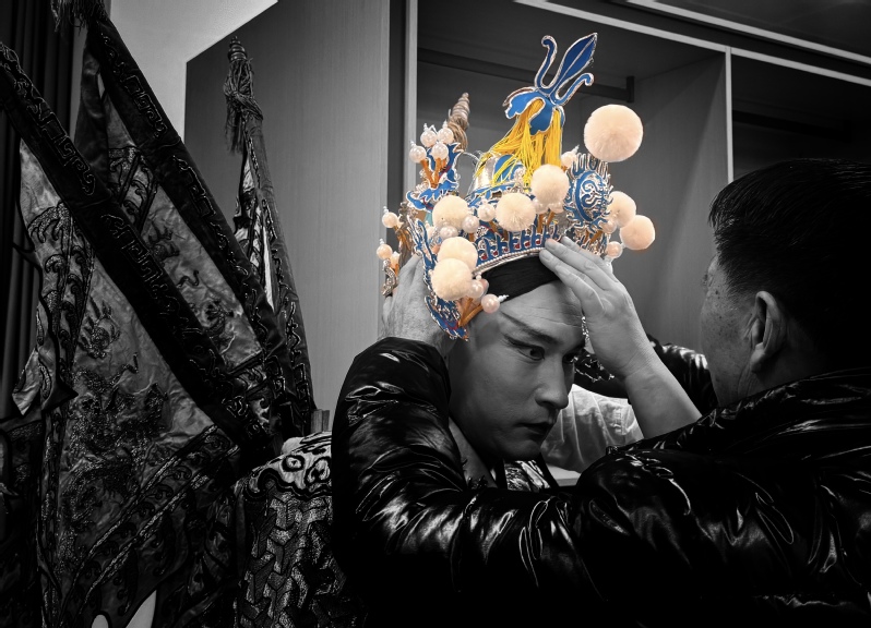 这张照片拍摄于新沂春晚后台,呈现了柳琴戏传承的动人瞬间。画面中,柳琴戏师傅正亲手为徒弟戴上精美的戏冠,师傅的双手轻柔而专注,饱含着殷切的期许。徒弟微微低头,神情庄重,流露着对师傅的敬重与对登台演出的期待。黑白的色调为画面增添了历史的厚重感,背景中隐约可见的戏服,凸显了戏曲艺术的独特氛围。这一画面不仅是技艺的传递,更是柳琴戏文化代代相传的生动写照。