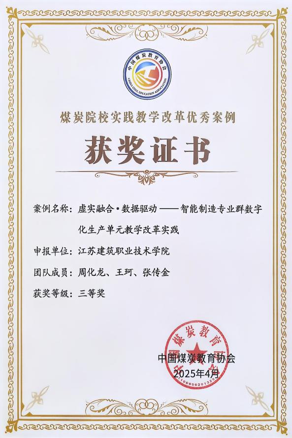 近日,中国煤炭教育协会公布了2025年煤炭类院校“实践教学改革优秀案例”遴选结果。由公司教师团队申报的《“虚实融合·数据驱动”——智能制造专业群数字化生产单元教学改革实践》项目,成功入选并荣获三等奖。