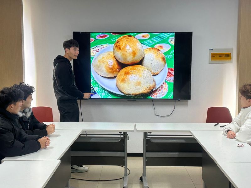活动中,少数民族同学依次登台,结合图文素材分享家乡魅力。维吾尔族同学细致讲解烤包子从揉面发酵、馅料搭配到馕坑烘烤的工艺,介绍库尔勒香梨的生长环境与清甜口感;蒙古族同学以照片展现胡杨林“生而千年不死”的生命力,阐释其生态与精神价值,现场互动热烈。